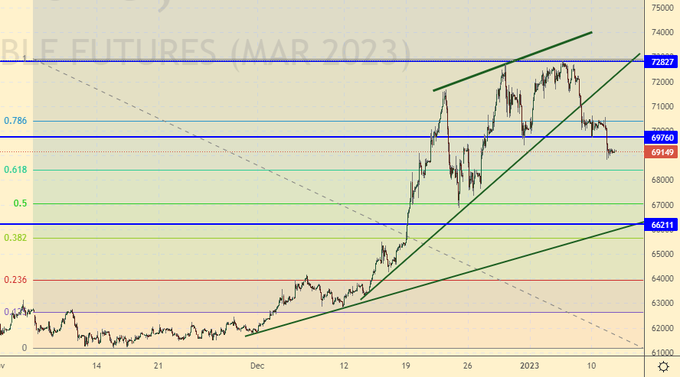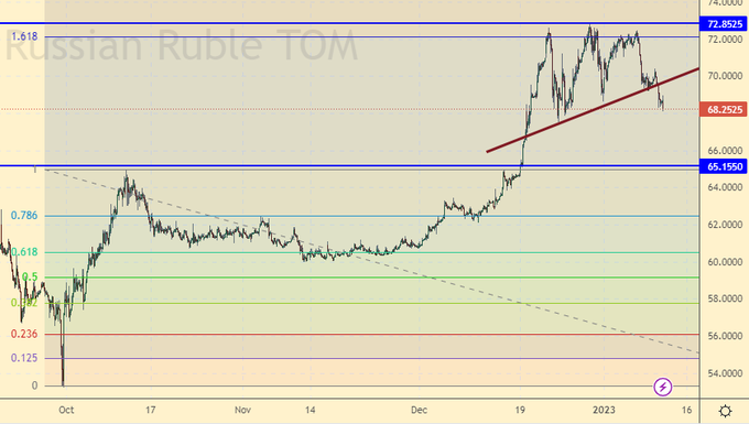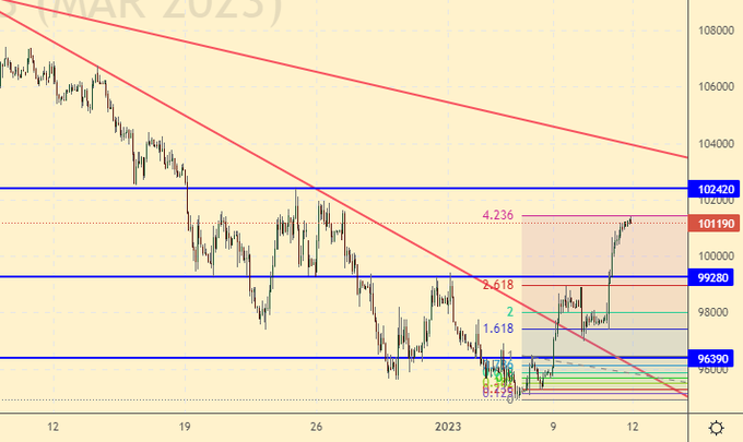 Учитывая перспективу укрепления рубля на 5% за следующие несколько дней, нам придется сдвинуть цели движения индекса РТС вверх. Скорее всего мы выйдем в район 105000 – 10700, только там будем продавать. Несмотря на краткосрочный рост российского рубля рост на рынке акций объяснить чем-либо кроме парковки денег хоть куда-нибудь невозможно. Экономика РФ продолжит падать в 2023-м году.