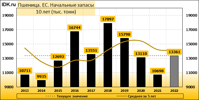 За прошедший месяц министерство сельского хозяйства США (USDA) на 12.01.2023 пересмотрело Баланс пшеницы для ЕС в сезоне 22/23 следующим образом: