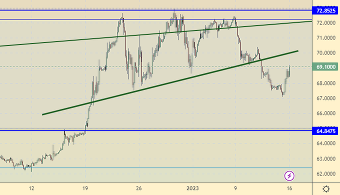 После укрепления рубля от 72.00 можно было рассчитывать на посещение парой уровня 65.00. Пока этого не произошло, но ход к 65.00 не отрицаем. В любом случае, пока делать ставки на ход пары ниже 65.00 не стоит. Таким образом, будем использовать откаты вниз для покупок американской валюты.