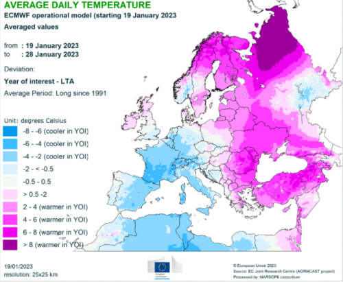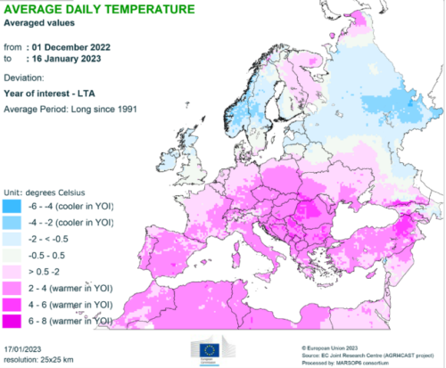 Более теплые, чем обычно, условия со среднесуточной температурой от 2 °C до 4 °C выше долгосрочного среднего значения (LTA) за 1991–2022 годы наблюдались на Пиренейском полуострове, юге и востоке Франции, большей части Центральной Европы, на Балканском полуострове, южной и западной Украине и большей части Турции, а также прибрежном районе Карского моря на самом севере европейской части России. Более отчетливые положительные температурные аномалии (от 4 °C до 6 °C выше LTA) наблюдались в восточной Турции, северо-западной Румынии и приграничных районах Украины, а также в некоторых частях стран Балканского полуострова. Теплые аномалии были особенно ярко выражены во второй половине отчетного периода (19 декабря 2022 г. – 16 января 2023 г.), когда они имели место практически по всей Европе. Сумма температур (Tbase = 0 °C) превышала LTA на 30% и более в большей части южной, западной и центральной Европы, а также в значительной части восточной Европы и Турции.