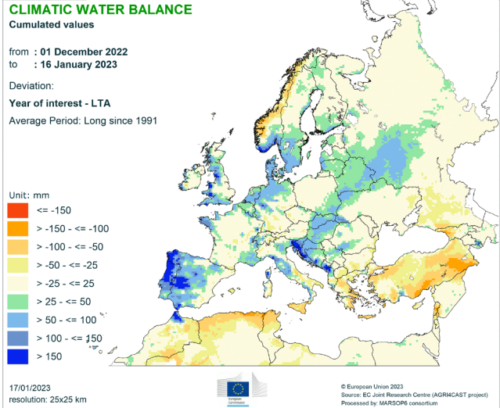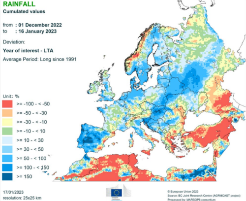Избыточные осадки наблюдаются в северной и центральной Европе, странах Бенилюкса и на западе Пиренейского полуострова. Это приветствуется там, где почвенная влага и грунтовые воды были истощены летом 2022 г., но не для медленно дренируемых почв, подверженных аноксии при температуре выше 0°С и механическому повреждению посевов при промерзании переувлажненных почв.