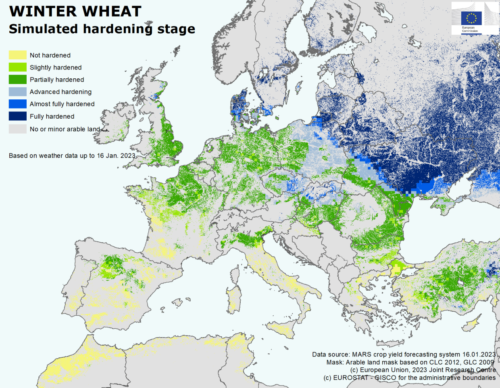 По сравнению с прошлым годом закаливание в середине декабря было более интенсивным, за которым последовала нетипичная фаза отверждения. Текущее состояние на середину января показывает, что озимые культуры находятся в менее продвинутой стадии закаливания по сравнению с тем же периодом 2022 года.