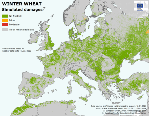 С положительной стороны, ущерб от мороза был ограничен. Сильные холода в Приволжском округе России (около 10 января), вероятно, нанесли ущерб, поскольку посевы были закалены, но недостаточно защищены снегом. Прогнозы погоды до 28 января не предвидят дополнительного ущерба от морозов в Европе.