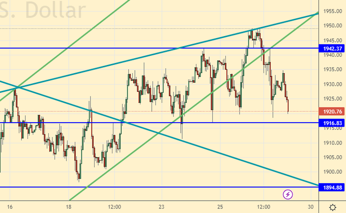 Перед нами формируется на часовых графиках разворотная модель «голова — плечи». Для завершения её формирования нам нужно пройти ниже 1915, что приведет к падению на высоту головы – 30 долларов. Таким образом, получаем отметку 1885. Не исключено, что падение будет и более сильным. В этом нет ничего странного. Рынок занимает равновесное положение перед заседанием ФРС.