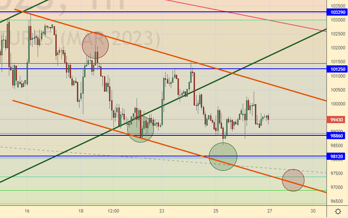 Картинка не из простых. Пока мы не пробились ниже 98000 говорить о продолжении падения будем осторожно. В теории, в данной ситуации остаются некоторые шансы на рост к 112000, однако фундаментально их подкрепить попросту нечем. Расходы на оборону и санкционное давление будут негативно сказываться на экономике.