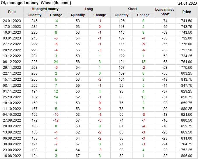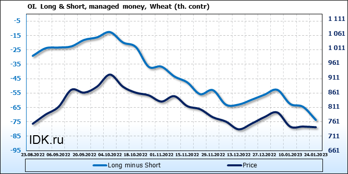 За прошедшую неделю, 18.01.23 — 24.01.23, разница между длинными и короткими позициями управляющих увеличилась на 9.2 тыс. контрактов. В тоже время, цена упала на 2.25 цента.