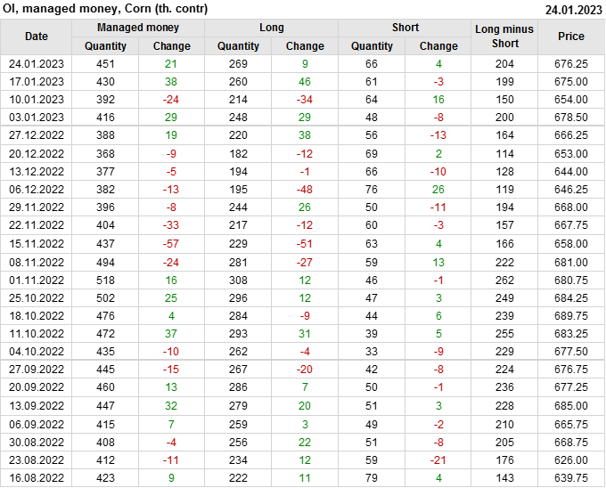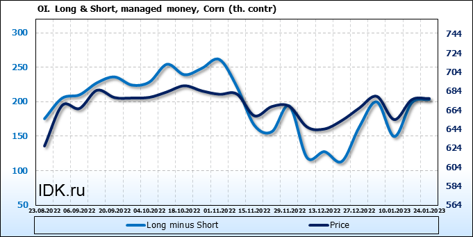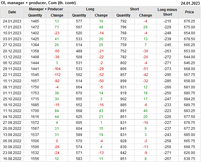 За прошлую неделю, 18.01.23 — 24.01.23, разница между длинными и короткими позициями управляющих увеличилась на 4.6 тыс. контрактов. В тоже время, цена выросла на 1.25 цента.