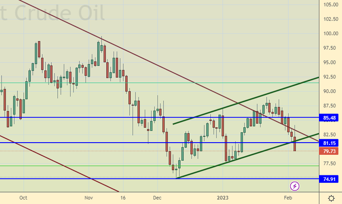 Продажа: нет. Кто в позиции от 82.00 и 80.50, перенесите стоп на 80.60. Цель: 66.00 (40.00) долларов за баррель.