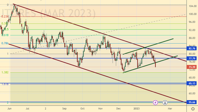Сценарий падения: ставка на падение себя оправдала. Будем держать шорт. Цель пока ориентировочно определим на уровне 70.00. Возможно и более сильное погружение.