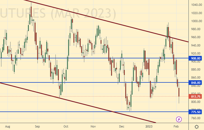 Сценарий роста: рассматриваем мартовский фьючерс, дата экспирации 14 марта. Идет изматывающая борьба в диапазоне. Быки пока не могут протолкнуть цены выше уровня 780.0, что должно было бы привести к ходу на 840.0. В идеале, для покупок нам нужен откат к 650.0, а в худшем случае рост выше уровня 780.0 центов за бушель.