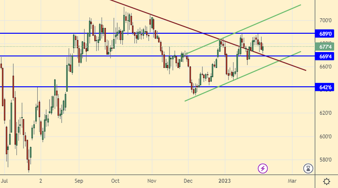 Продажа: сейчас. Стоп: 698.0. Цель: 590.0 (550.0). Кто в позиции от 688.0, держите стоп на 698.0. Цель: 590.0 (550.0) центов за бушель
