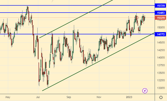 Сценарий роста: рассматриваем мартовский фьючерс, дата экспирации 14 марта. Продолжим отказываться от покупок. Быки не могут взять уровень 1550, проявляя слабость.