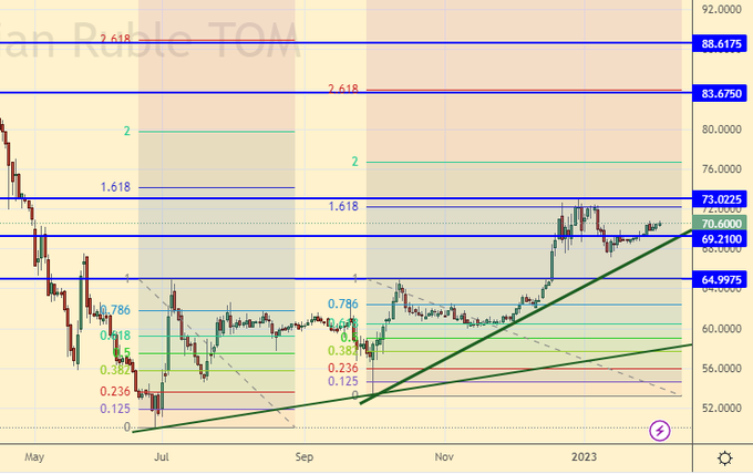 Сценарий падения: продолжим держать шорт от 72.50 с целью на 65.60. Шансы на падение доллара возросли после того, как стало ясно, что Минфин будет продавать на рынке по 126.6 млн. долларов в день.