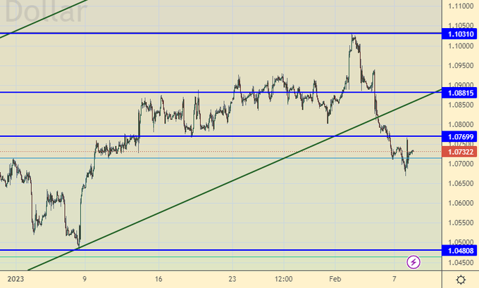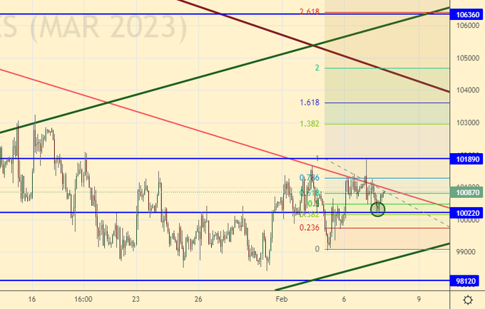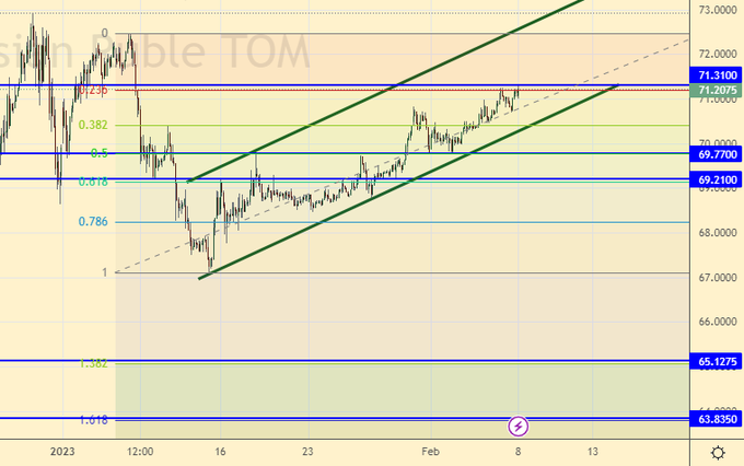 Подошли мы к уровням, от которых возможен разворот вниз. Шансов немного, учитывая дефицит бюджета за январь в 1.76 трлн. рублей, но все-таки какие-то продажи валюты идут и они могут несколько укрепить рубль. Шорт с небольшим риском отсюда оправдан.