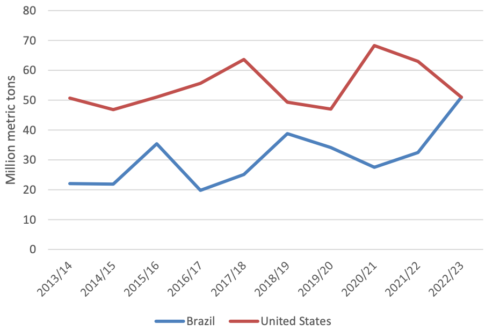 Прогнозируется, что экспорт кукурузы Бразилии в 2022/23 г. (октябрь-сентябрь) сравняется с экспортом кукурузы из США на уровне 51 млн тонн благодаря расширению производства и сильному экспорту во второй половине 2021/22 маркетингового года (март 2022 г. — февраль 2023 г.). Экспорт кукурузы из Бразилии превысил экспорт из США только один раз, в засушливый 2012/13 год. С октября 2022 года Бразилия экспортировала около 25 миллионов тонн кукурузы, что намного превышает аналогичный показатель любого предыдущего года.