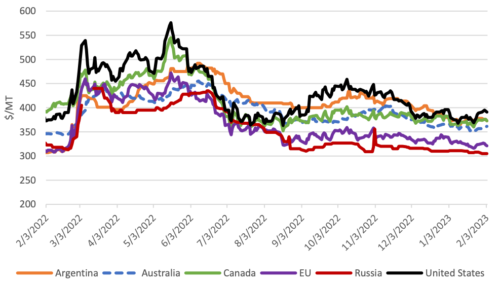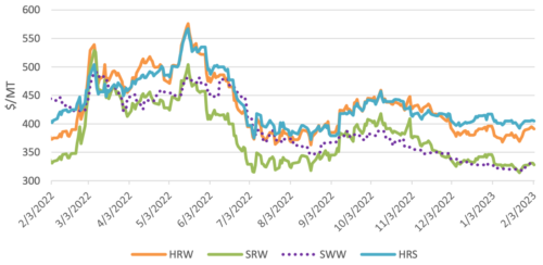 После январского отчета WASDE котировки в США немного выросли для всех классов, кроме Soft Red Winter, что отражает более высокий мировой спрос. Hard Red Winter (HRW) подорожала на 17 долларов за тонну до 391 доллара в основном из-за сохраняющихся засушливых условий в ключевых производственных районах. Soft White Winter (SWW) подорожала на 7 долларов за тонну до 329 долларов, отражая увеличение экспортного спроса. Цена Hard Red Spring (HRS) выросла на 4 доллара за тонну по сравнению с прошлым месяцем до 405 долларов. Soft Red Winter (SRW) завершила месяц без изменений на уровне $328/т, так как экспорт пшеницы из Черного моря незначителен.