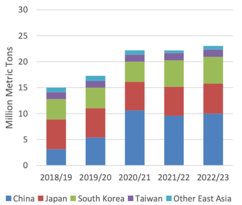 Австралия в основном экспортирует на крупные рынки потребления пшеницы в Юго-Восточной Азии и Восточной Азии, пользуясь преимуществом своей близости и более низкими фрахтовыми ставками, чем у основных конкурентов. С обильными поставками из Австралии прогнозируется увеличение импорта в регионы в 2022/23 TY за счет увеличения в Китае, Японии, Малайзии, Южной Корее, Тайване, Таиланде и Вьетнаме.
