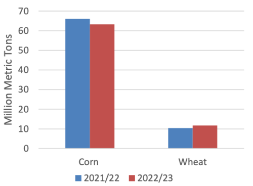 Напротив, экспорт кукурузы из США начал медленно. Производство в 2022/23 году было меньше, чем первоначально прогнозировалось, и проблемы с логистикой на реке Миссисипи в течение нескольких месяцев после сбора урожая удерживали цены в США на высоком уровне, а объемы на низком уровне, особенно в связи с тем, что кукуруза из США конкурировала с поставками других экспортеров по конкурентоспособным ценам.