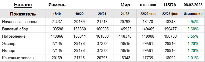 За прошедший месяц министерство сельского хозяйства США (USDA) на 08.02.2023 пересмотрело Баланс ячменя для Мира в сезоне 22/23 следующим образом: