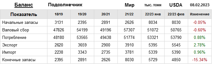 За прошедший месяц министерство сельского хозяйства США (USDA) на 08.02.2023 пересмотрело Баланс подсолнечника для Мира в сезоне 22/23 следующим образом: