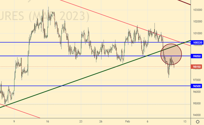 Продажа: нет. Кто в позиции от 101000, держите стоп на 100700. Цель: 80000 (50000).