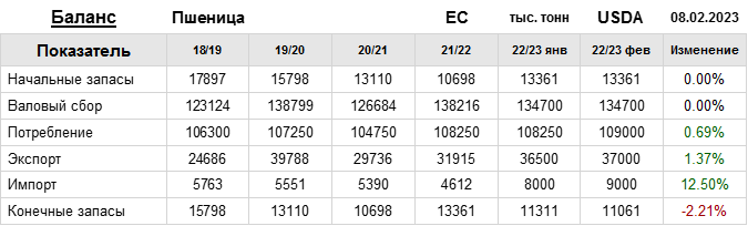 За прошедший месяц министерство сельского хозяйства США (USDA) на 08.02.2023 пересмотрело Баланс пшеницы для ЕС в сезоне 22/23 следующим образом: