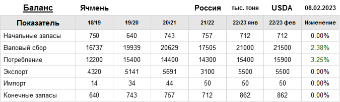 За прошедший месяц министерство сельского хозяйства США (USDA) на 08.02.2023 пересмотрело Баланс ячменя для России в сезоне 22/23 следующим образом: