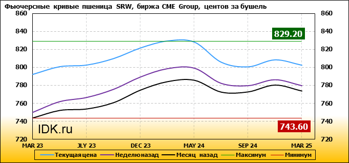 На 13.02.2023 стоимость пшеницы SRW на бирже CME Group по контракту MAR 23 составила 792 цента за бушель. За прошедшую неделю стоимость пшеницы SRW выросла на 41.8 цента/бушель. Как мы видим на графике, фьючерсная кривая имеет периоды, когда более дальний фьючерс дешевле ближнего. Состояние бэквардации наблюдаем на следующих контрактах: MAY 24; JLY 24; SEP 24; MAR 25. Таким образом, трейдеры предполагают, что возможно превалирование предложения над спросом в указанные периоды.