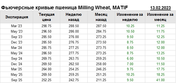 На 13.02.2023 стоимость пшеницы Milling Wheat на бирже MATIF по контракту Mar ’23 составила 298.75 евро за тонну. За прошедшую неделю стоимость пшеницы Milling Wheat выросла на 10.25 евро/тонна. Как мы видим на графике, фьючерсная кривая имеет периоды, когда более дальний фьючерс дешевле ближнего. Состояние бэквардации наблюдаем на следующих контрактах: May ’23; Sep ’23; Sep ’24; Dec ’24; Mar ’25; Sep ’25. Таким образом, трейдеры предполагают, что возможно превалирование предложения над спросом в указанные периоды.