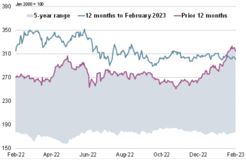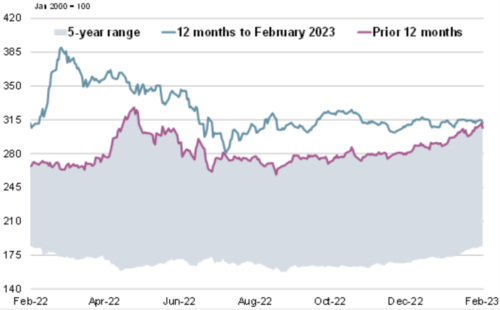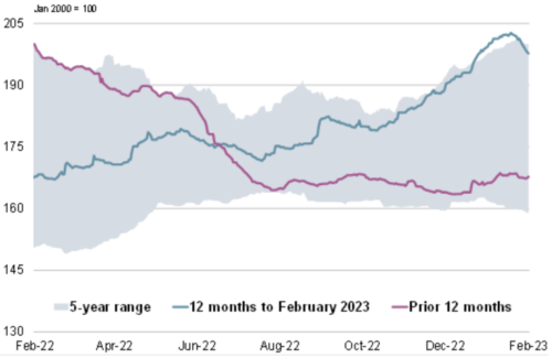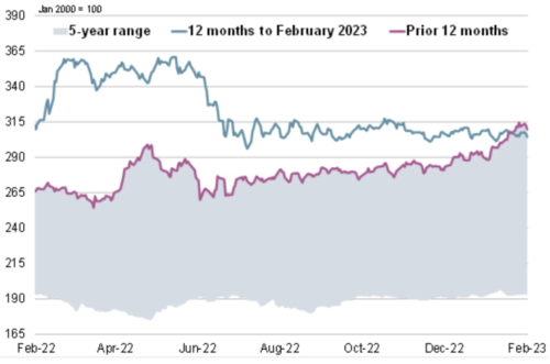 После падения до 16-месячного минимума в конце января субиндекс IGC GOI для пшеницы впоследствии восстановился на фоне опасений по поводу производства новых культур в США и возобновившихся опасений по поводу будущего Черноморского экспортного коридора, прибавив 1%.