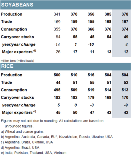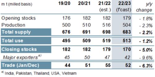 Мировое производство риса, связанное с меньшими урожаями у ключевых производителей, может сократиться на 2% в годовом исчислении. В связи с прекращением мер по обеспечению продовольственной безопасности, связанных с COVID-19, в Индии, а также вероятным спадом в Китае потребление может сократиться на 6 млн тонн в год, а запасы сократятся. Прогнозируется, что в целом запасы основных экспортеров сократятся на 10% в годовом исчислении из-за сокращения запасов у поставщиков из Южной Азии. Ожидается, что торговля сократится на 3 млн т, включая меньшие закупки Китаем.