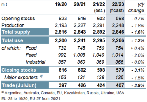Первоначальные прогнозы Совета на 2023–2024 годы предусматривают небольшой рост посевных площадей кукурузы в мире, но снижение посевных площадей под ячменем. Учитывая неопределенность в отношении сельскохозяйственной деятельности на неподконтрольных территориях, цифры для Украины являются весьма условными, но предполагаемая площадь значительно ниже по сравнению с прошлым годом. Мировой прогноз по пшенице заключается в сокращении предложения, и, поскольку общее потребление имеет тенденцию к росту, прогнозируется сокращение запасов.
