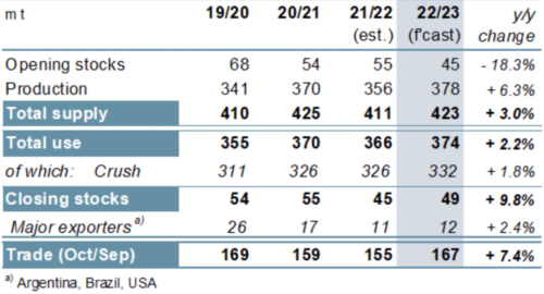 Мировое производство сои в 2022/23 г., подкрепленное высоким урожаем в Бразилии, а также прибылью мелких производителей, вырастет на 6% в годовом исчислении до пикового уровня. Расширение потребления соевых продуктов лежит в основе рекордного использования, в то время как ожидается скромное накопление запасов, хотя резервы экспортеров остаются исторически ограниченными. Прогнозируется, что торговля вырастет на 7% до 167 млн т, при этом бразильские экспортеры намерены увеличить свою долю спроса, поскольку другие поставщики отгружают меньше.
