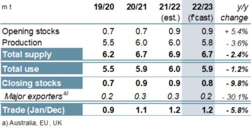 В первом официальном прогнозе Совета по спросу и предложению бобов мировое производство прогнозируется на 4% в годовом исчислении в 2022/23 году, в основном из-за меньшего производства в Австралии, что также приведет к падению потребления и сокращению уровня запасов. Прогнозируется, что мировой спрос на импорт снизится из-за сокращения поставок в Египет, который является крупнейшим покупателем, в то время как австралийский экспорт может сократиться.