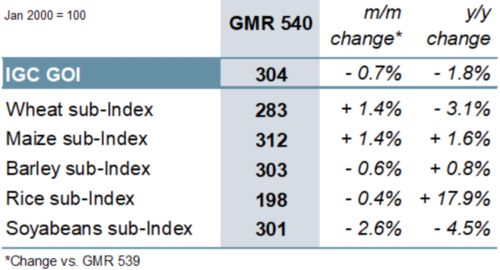 Из-за смешанных кросс-товарных изменений индекс IGC по зерну и масличным культурам (GOI) снизился на 1% в месячном исчислении, т. е. на 2% по сравнению с прошлым годом.
