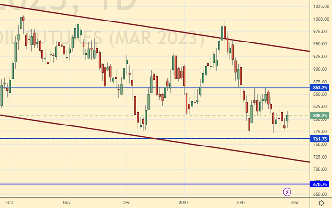 Сценарий роста: рассматриваем апрельский фьючерс, дата экспирации 21 марта. Пока не покупаем. Только если рынок вырастет выше 81.50 откроем лонг.