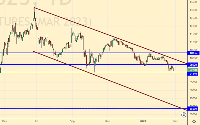 Сценарий роста: рассматриваем апрельский фьючерс, дата экспирации 29 марта. Можно подержать открытый на прошлой неделе лонг. Новых позиций не открываем.