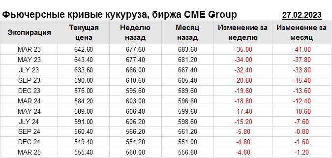 На 27.02.2023 стоимость кукурузы на бирже CME Group по контракту MAR 23 составила 642.6 цента за бушель. За прошедшую неделю стоимость кукурузы на площадке CME Group упала на 35 центов/бушель. Как мы видим на графике, фьючерсная кривая имеет периоды, когда более дальний фьючерс дешевле ближнего. Состояние бэквардации наблюдаем на следующих контрактах: JLY 23; SEP 23; DEC 23; SEP 24; DEC 24. Таким образом, трейдеры предполагают, что возможно превалирование предложения над спросом в указанные периоды.