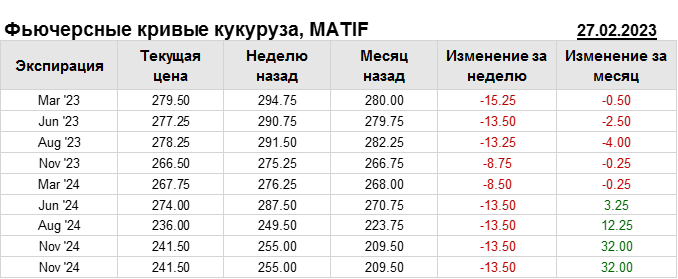 На 27.02.2023 стоимость кукурузы на бирже MATIF по контракту Mar ’23 составила 279.5 евро за тонну. За прошедшую неделю стоимость кукурузы на европейской площадке упала на 15.25 евро/тонна. Как мы видим на графике, фьючерсная кривая имеет периоды, когда более дальний фьючерс дешевле ближнего. Состояние бэквардации наблюдаем на следующих контрактах: Jun ’23; Nov ’23; Aug ’24. Таким образом, трейдеры предполагают, что возможно превалирование предложения над спросом в указанные периоды.