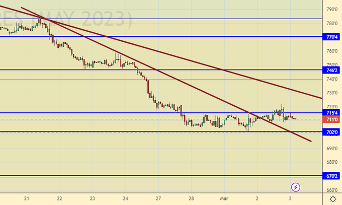 Продолжаем ждать ветку вниз на 670.0, после чего мы должны вырасти. Будет ли этот рост сильным? Нет, не будет. Рынок подождет прогноза от USDA, который выйдет в мае. Но ожидание не запрещает нам увидеть подъем с 670.0 до 770.0.