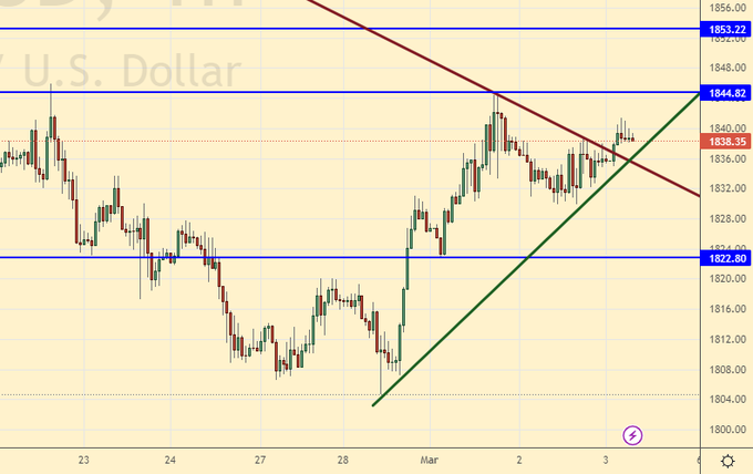 Даже если мы вновь пошли наверх, то нам надо нарисовать одну ветку вниз для того, чтобы штурмовать новые высоты от уровня 1820. Если отката не будет, и мы пойдем выше 1850, то этим надо будет воспользоваться для продаж от района 1860. Если откат будет, то в перспективе можно рассмотреть покупки от 1820. Но более интересными были бы лонги от 1790.