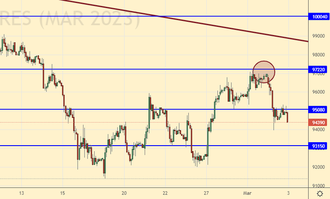 Продажа: при подходе к 100000. Стоп: 102000. Цель: 80000 (50000, 20000). Кто в позиции от 97000, перенесите стоп на 97100. Цель: 80000 (50000, 20000).