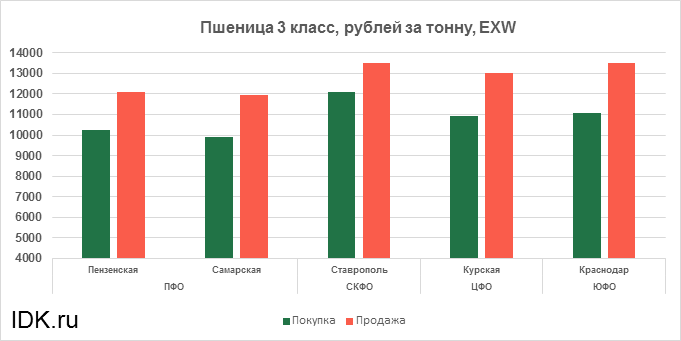 За прошедшую неделю с 27.02.2023 по 03.03.2023 средняя цена на пшеницу 3-го класса, согласно выставленным заявкам трейдеров, упала по всем округам на 30 рублей. Средняя цена составляет 12039 рублей за тонну.