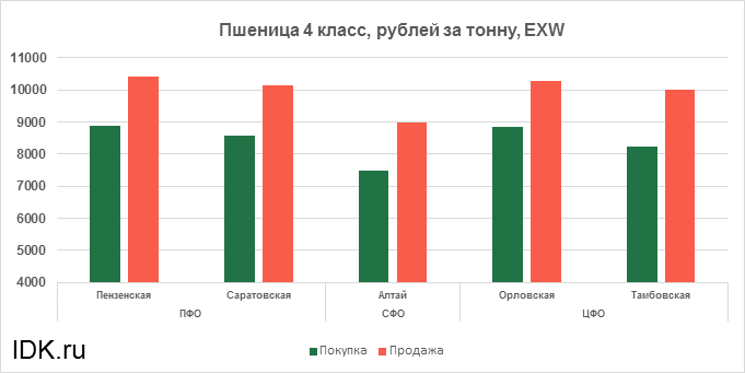 За прошедшую неделю с 27.02.2023 по 03.03.2023 средняя цена на пшеницу 4-го класса, согласно выставленным заявкам трейдеров, упала по всем округам на 103 рубля. Средняя цена составляет 8986 рублей за тонну.