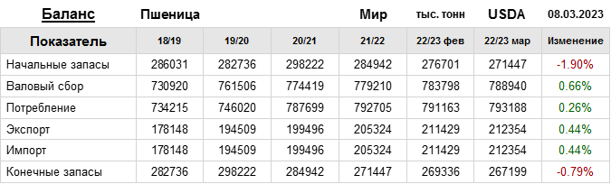 За прошедший месяц министерство сельского хозяйства США (USDA) на 08.03.2023 пересмотрело Баланс пшеницы для Мира в сезоне 22/23 следующим образом: