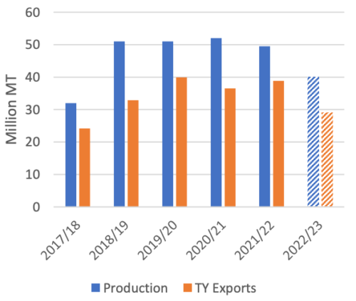 Экспорт кукурузы из Аргентины (октябрь 2022 г. — сентябрь 2023 г.) прогнозируется на уровне 29,0 млн тонн, что является самым низким показателем с 2017/18 года. На производство в этом году, как и в 2017/18 году, сильно повлияла засуха, которая, как ожидается, сократит поставки на экспорт. Сокращение происходит в трудное время для глобальных поставок кукурузы.