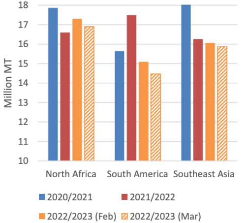 Продление Черноморской зерновой инициативы еще предстоит пересмотреть после ее нынешнего истечения 18 марта, что оставляет некоторую неопределенность в отношении будущего украинского экспорта зерна. Напротив, Бразилия, по прогнозам, соберет рекордный урожай в 125,0 млн тонн и экспортирует рекордные 52,0 млн тонн (октябрь 2022 г. — сентябрь 2023 г.). Хотя ожидается, что Бразилия будет экспортировать большие объемы в период с июля по сентябрь после сбора урожая сафрини, в конечном итоге мировая торговля в 2022/23 году, по прогнозам, сократится на 2,6 миллиона тонн в этом месяце.