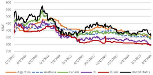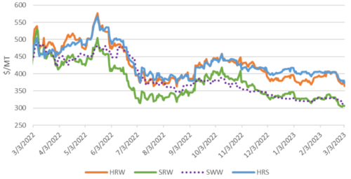 После февральского отчета WASDE котировки в США упали для всех классов, отражая увеличение мировых экспортных поставок, снижение экспортных цен в Черном море и ЕС и в целом благоприятную погоду в США. Hard Red Spring (HRS) подешевела на 31 доллар за тонну по сравнению с прошлым месяцем до 374 долларов. Hard Red Winter (HRW) подешевел на 27 долларов за тонну до 364 долларов из-за некоторых столь необходимых дождей в ключевых районах выращивания. Soft Red Winter (SRW) подешевела на 22 доллара за тонну до 306 долларов. Soft White Winter (SWW) подешевела на 17 долларов за тонну до 312 долларов.