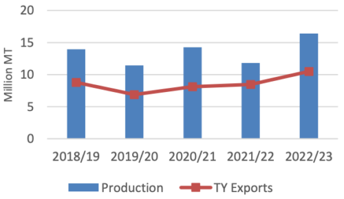 Производство пшеницы в Казахстане прогнозируется на уровне 16,4 млн тонн в 2022/23 году, что является самым большим урожаем с рекордных 22,7 млн тонн в 2011/12 году. Прогнозируется, что при наличии достаточных запасов экспорт пшеницы из Казахстана достигнет 10,5 млн тонн, что на 2,0 млн больше, чем в предыдущем году.