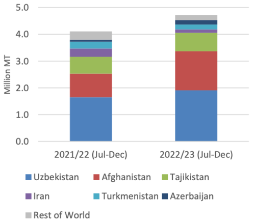 В этом торговом году Казахстан отправил большие объемы зерна пшеницы и муки в эти традиционные направления, экспортируя более 1,0 миллиона тонн в месяц в период с октября по декабрь 2022 года. Экспорт в июле-декабре в основные направления увеличился на 600 000 тонн по сравнению с предыдущим годом, с наибольшим увеличением для Афганистана и Азербайджана.